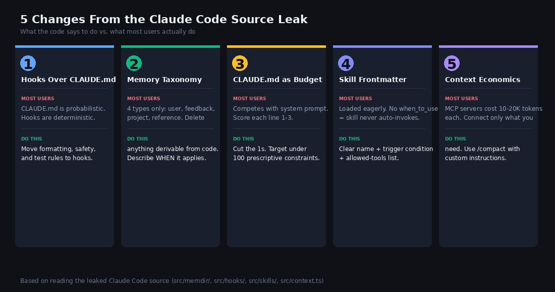 The hooks insight was the biggest. But four other patterns from the leaked code changed how I think about my setup.